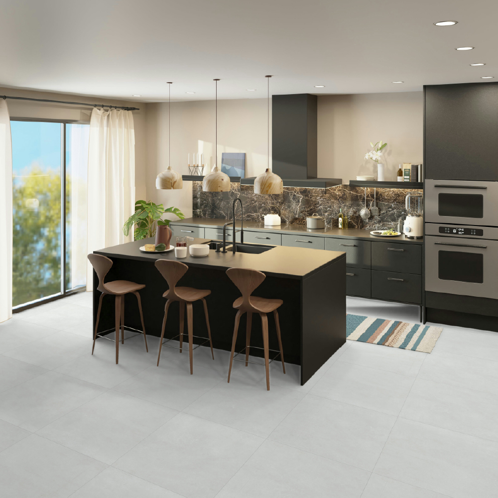 Para lograr este efecto, los diseñadores suelen elegir pisos de gran formato, que reducen las juntas visibles y crean una sensación de amplitud.
