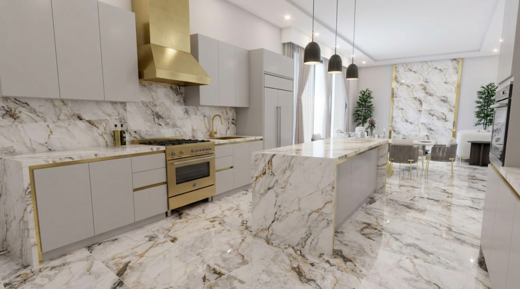 Por un lado los pisos con efecto mármol siguen siendo uno de los estilos más buscados en las cocinas.